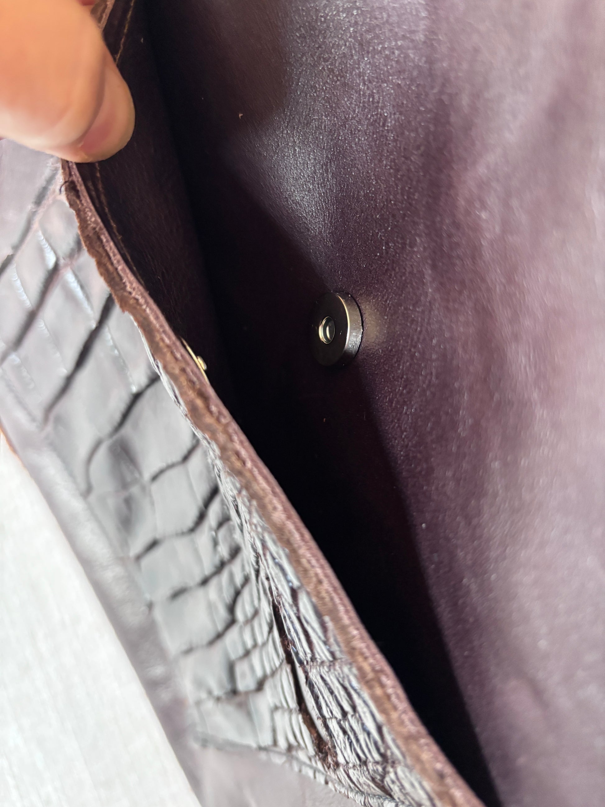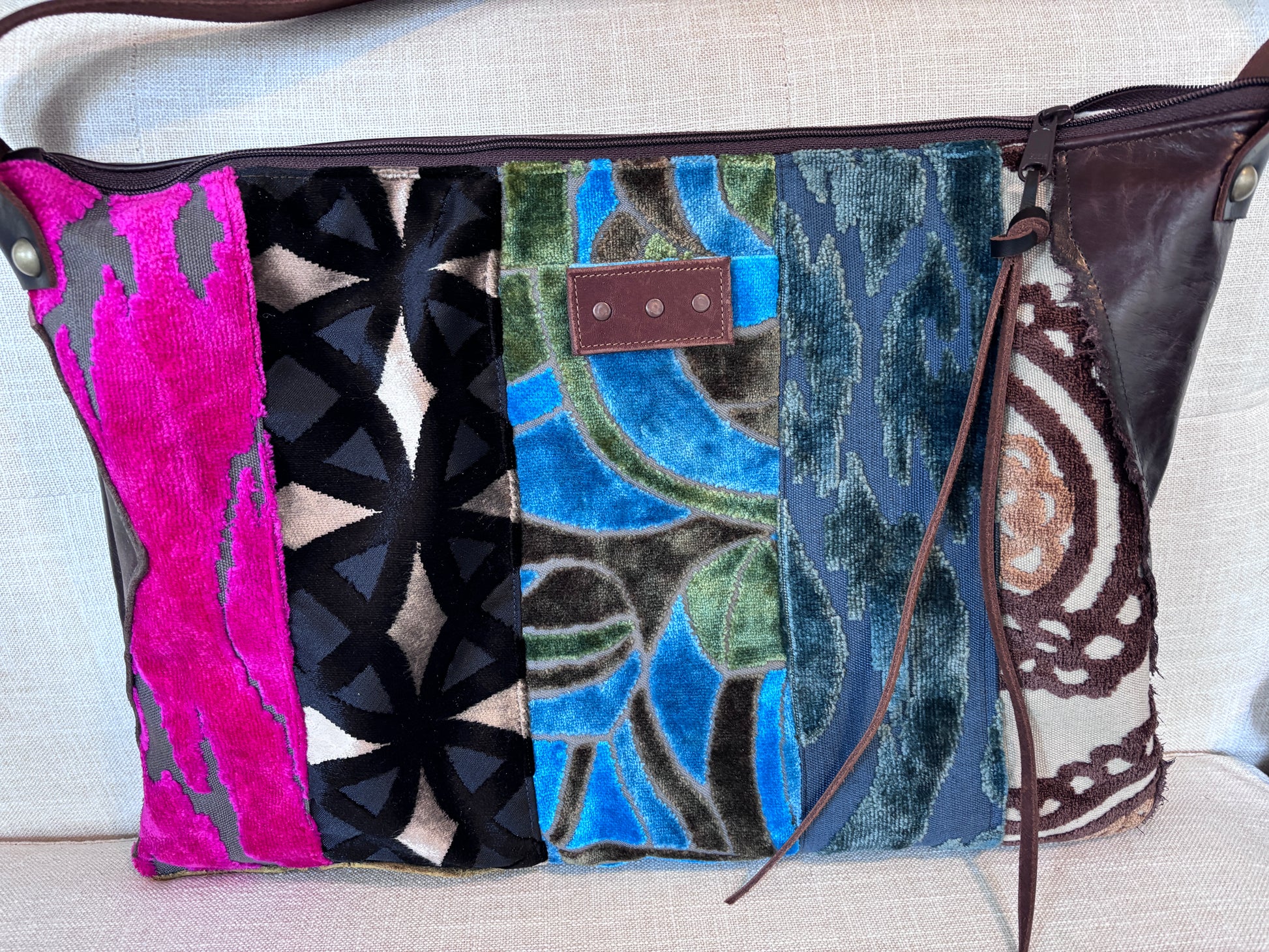 Frontside is a mix of rich colors in a textured cut velvet and a spot for your phone or sunglasses, magnetic closure and more rustic leather trim.