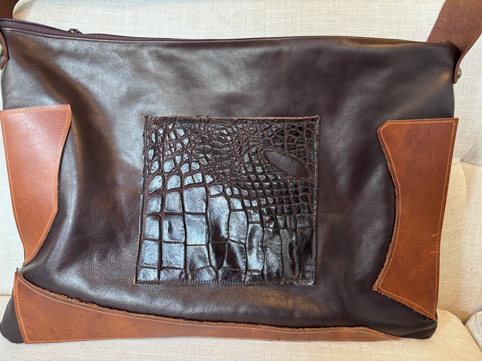 Gorgeous one of a kind, handmade shoulder bag. Full leather back with genuine alligator hide pocket. Rustic leather trim.