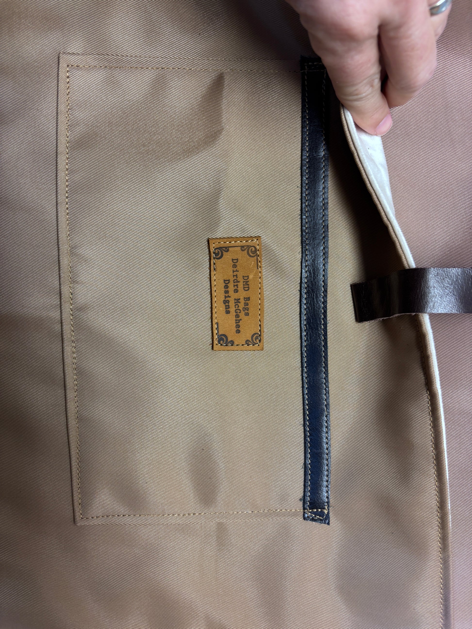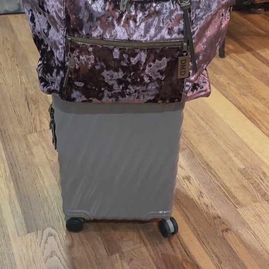 The front has a nice zipper pocket with spot for ID/credit card and well as a zipper pocket to keep cash/passport secure. The backside strap secures your bag to your rolling bag. Shown here with the international flight approved rolling bag (slightly smaller). Bottom is a leather reinforced with leather strapping and bronze feet.