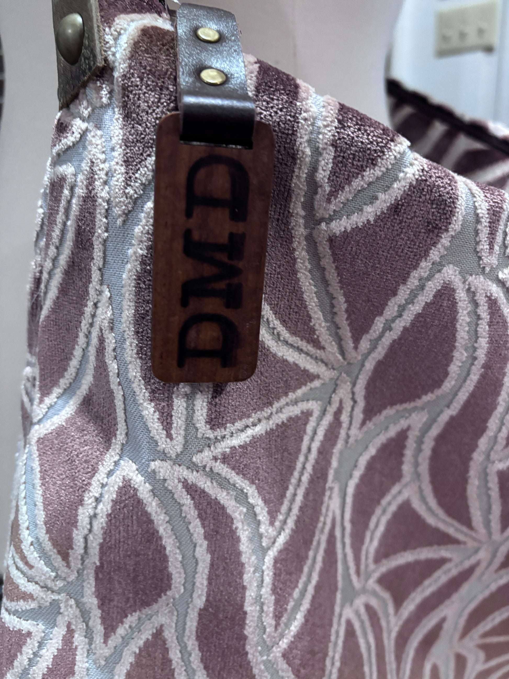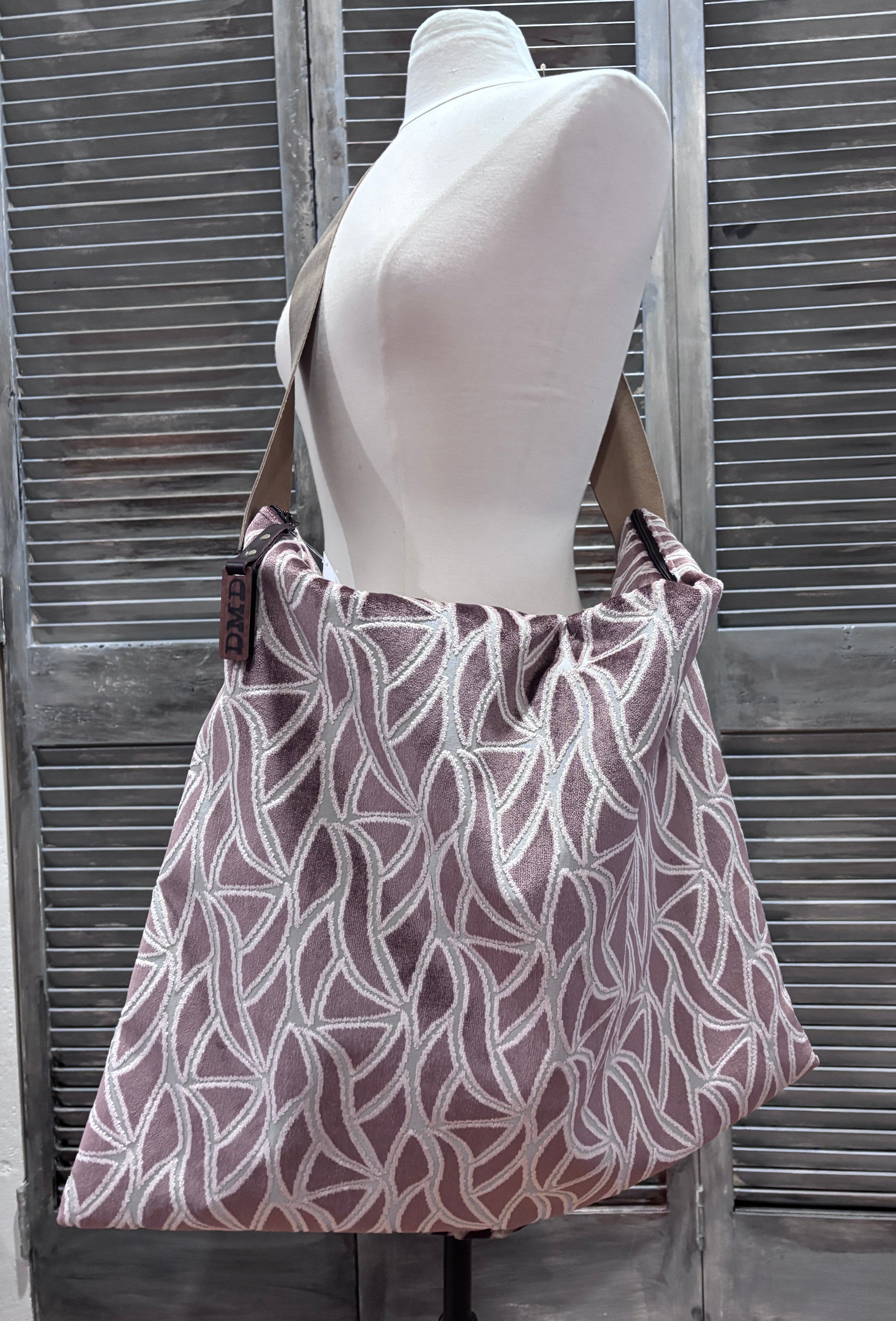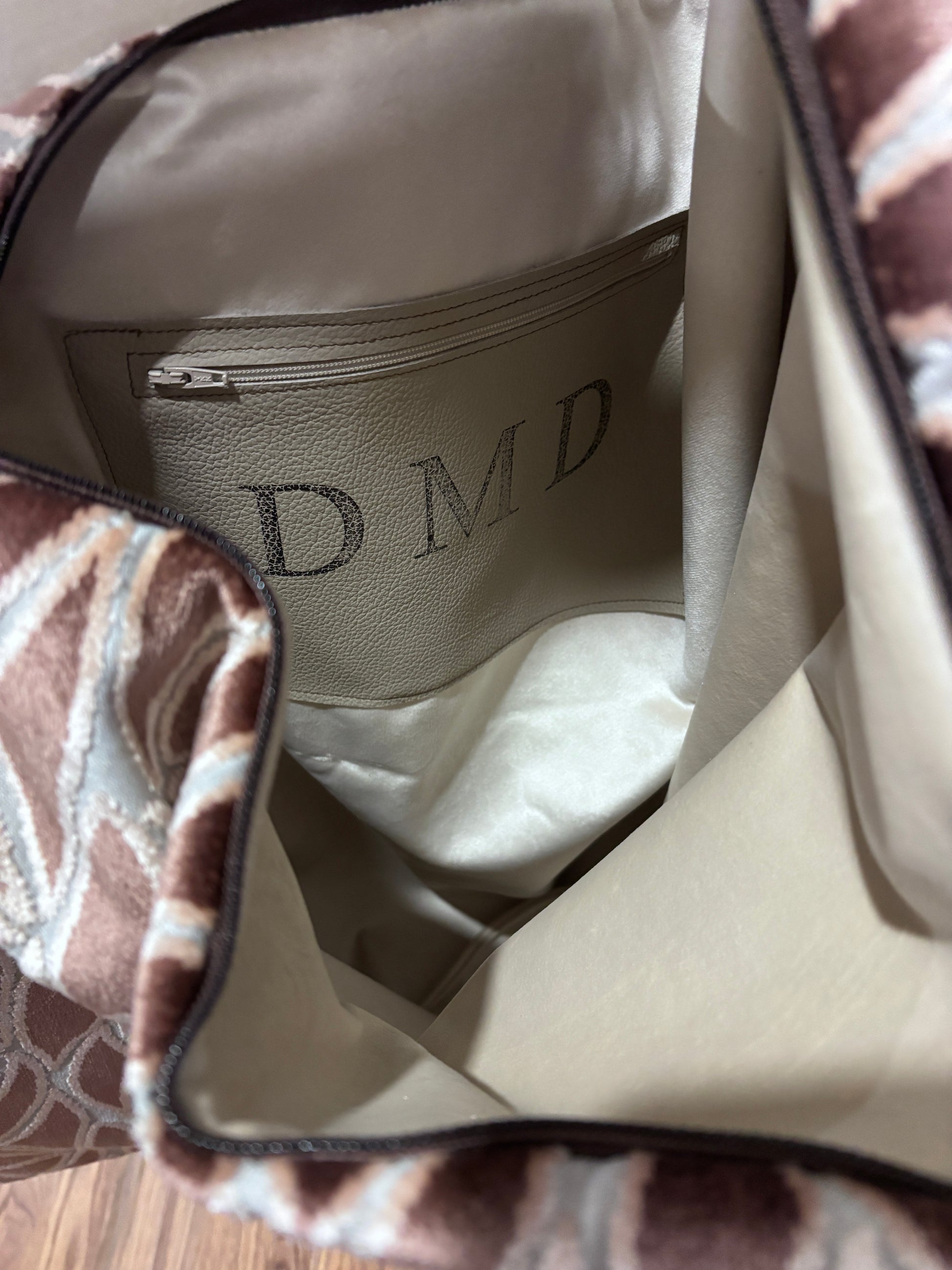 26” wide x 20” tall with wide leather shoulder or crossbody strap. Interior zipper pocket.